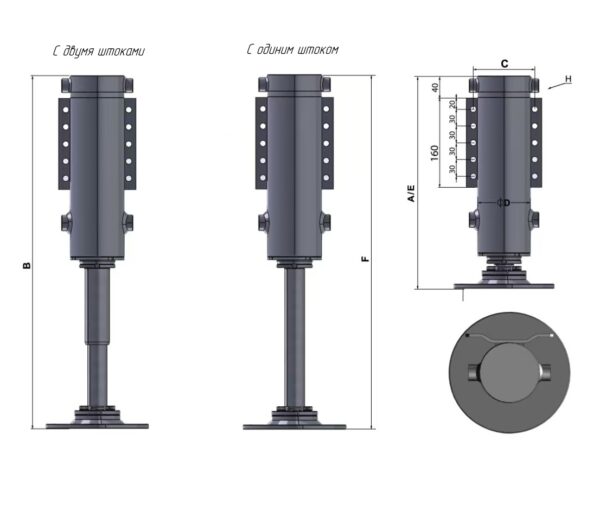 • Цилиндр с одним или двумя штоками на выбор (в зависимости от дорожного просвета);