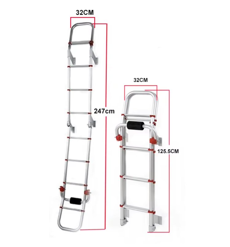 Складная лестница для доступа на крышу. Монтаж в четырех точках к задней стене автодома. Высота неподвижной части 1580 мм. Высота складной части 860 мм. Максимальная нагрузка 300 кг. Цвет алюминий.