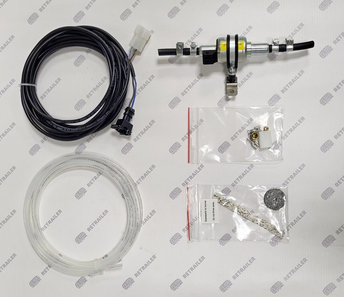 Монтажный комплект для установки в автодом. Выхлопная труба из нержавеющей стали (⌀60 мм, длина 250 см), термоизоляция для этой трубы (⌀102 мм), гофра забора воздуха для горения (⌀75 см, длина 120 см) с фланцем, хомуты для монтажа.