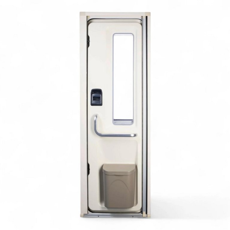 Посадочный размер 600*1810 мм. Сверху и снизу радиусные углы R 90 мм. Фиксация закрытого положения в двух точках. Для толщины стены 28-36 мм. Двойное акриловое окно с солнцезащитной шторкой. Петли справа. Опционально можно оснастить электрозамком с пультом ДУ, мусорной корзиной.
