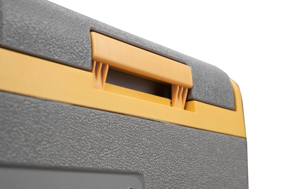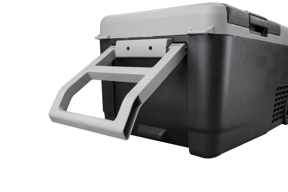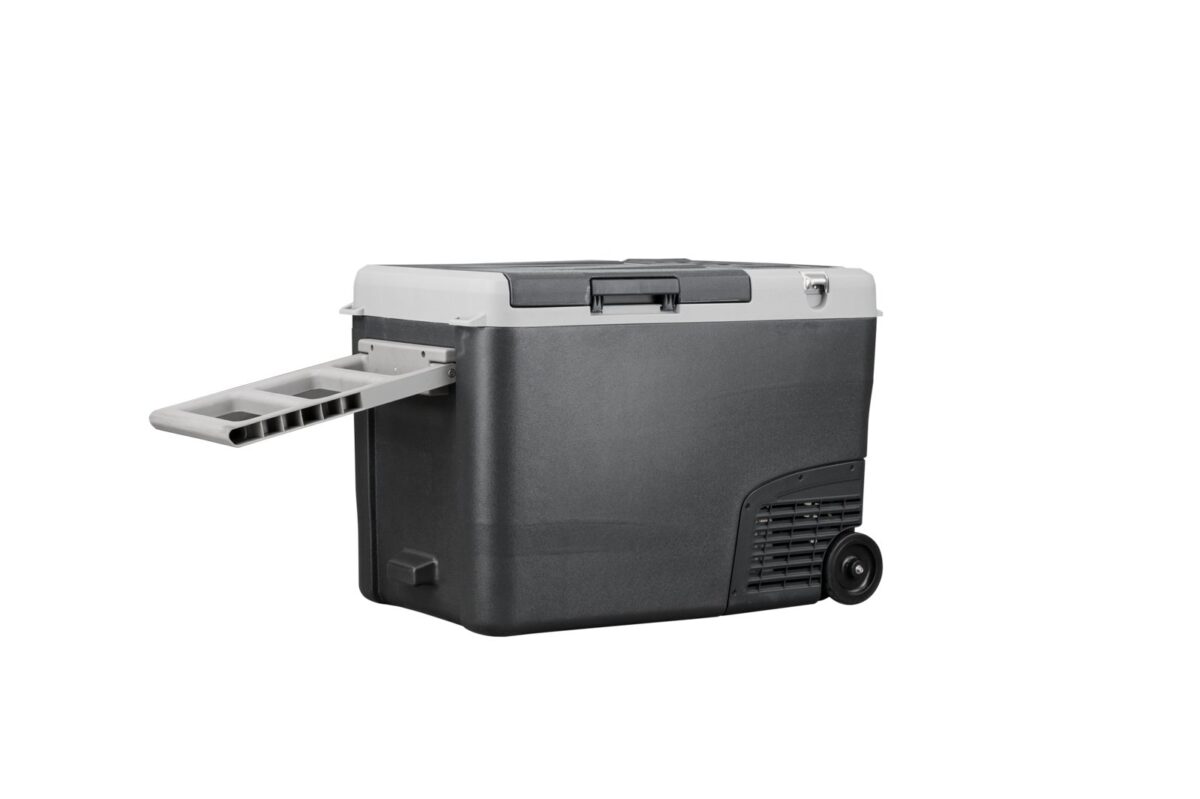 Корпус переносного холодильника выполнен из ударопрочного пластика, конструкция рассчитана на поездки по неровным дорогам и уверенно выдерживает наклоны до 30 градусов без остановки работы компрессора. Для транспортировки предусмотрены колеса и выдвижная ручка, поэтому даже полностью загруженный холодильник можно легко перекатить от автомобиля к месту стоянки.