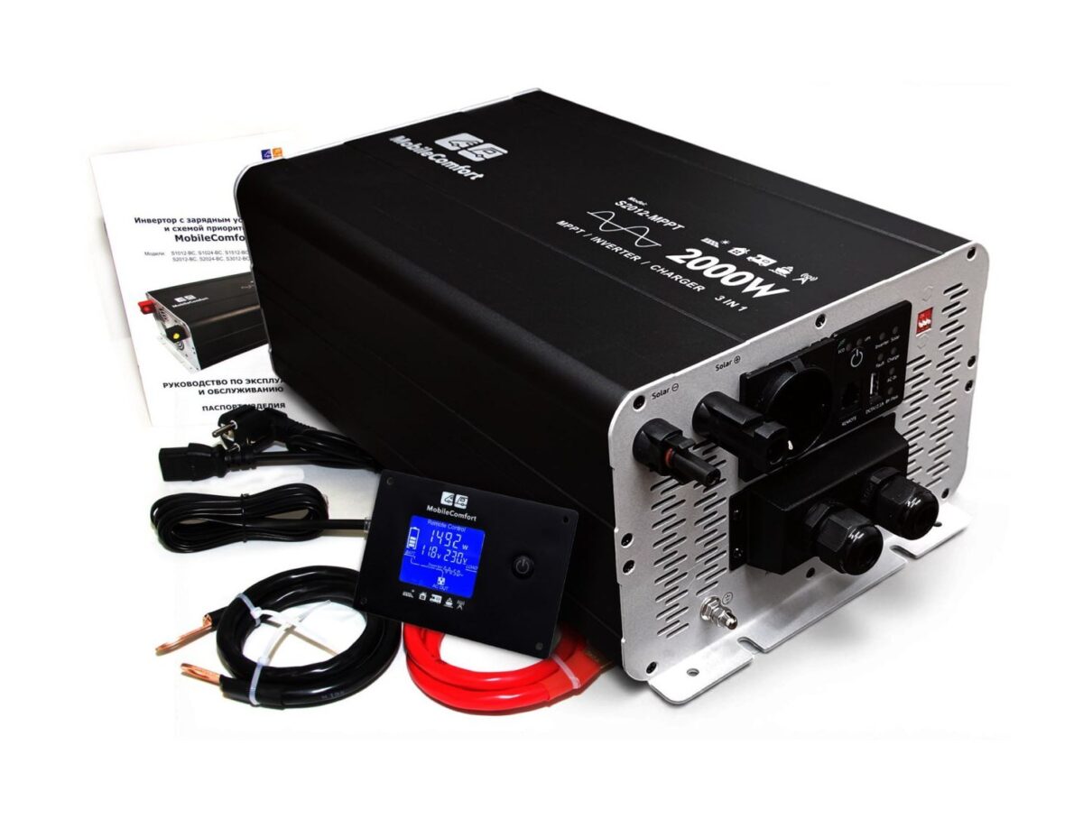 Устройство Mobile Comfort S 4 в 1 — зарядное устройство от переменного тока, контроллер заряда от солнечных панелей MPPT, инвертор и схема приоритета. Удобная выносная панель управления.