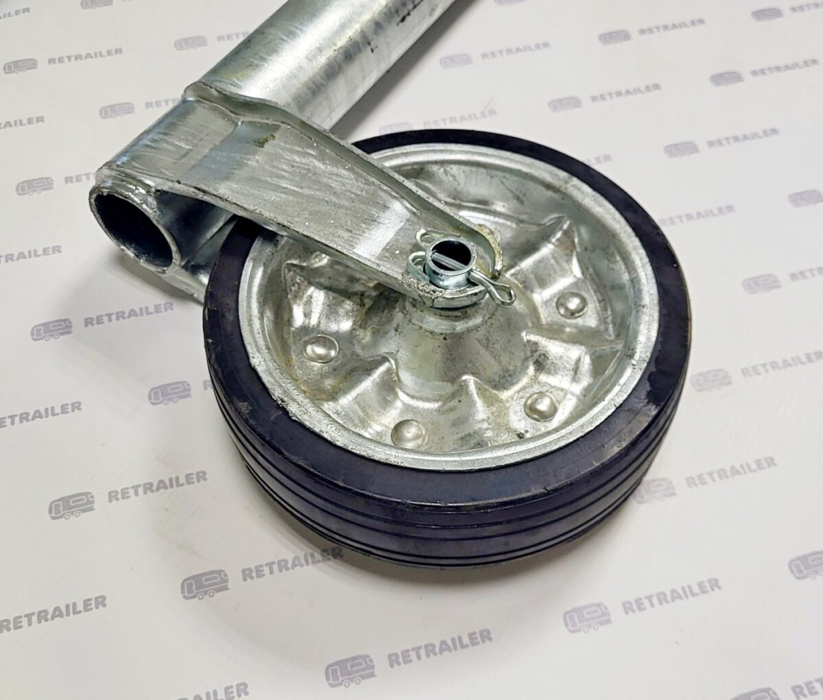 Pinstop. Колесо со встроенным тормозом. Для прицепов с максимально разрешенной массой до 750 кг. Статическая нагрузка: 150 кг. Труба: Ø48 мм. Динамическая нагрузка: 90 кг. Вес: 4.8 кг. Колесо: Ø200*50 мм, резина.