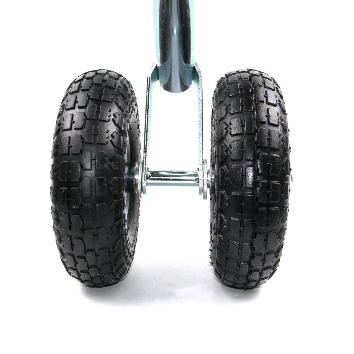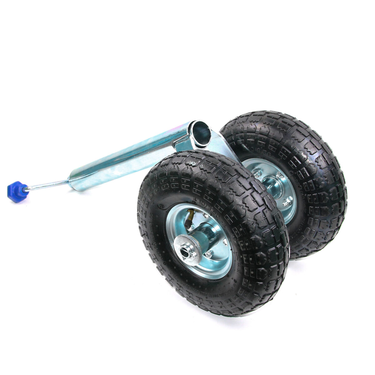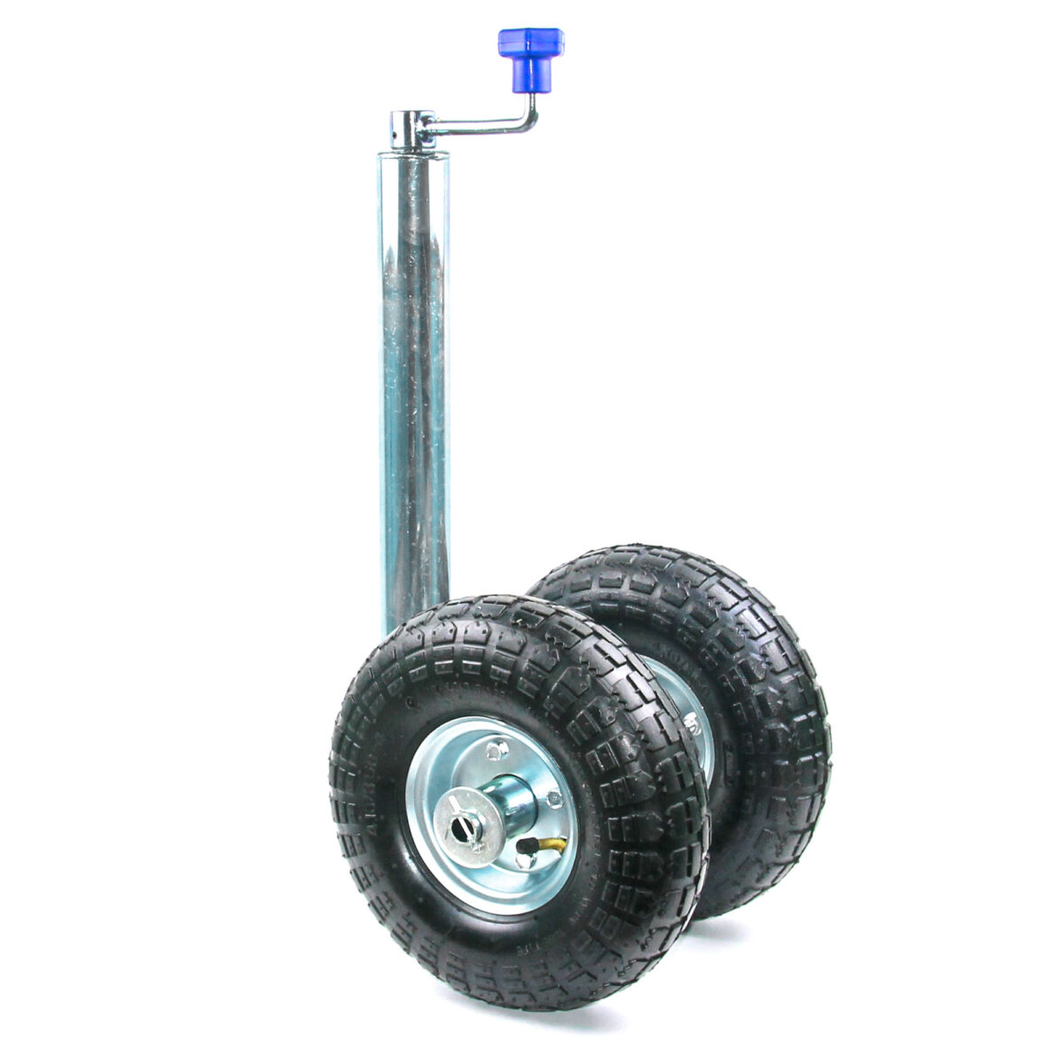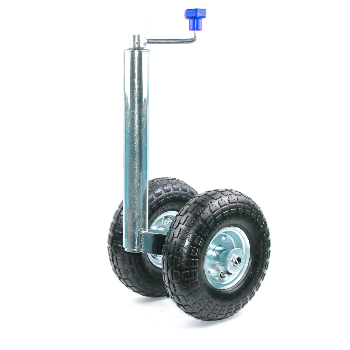 TRAILERCOM PRO. Twin. Двойное колесо с пневмошиной. Статическая нагрузка: 275 кг. Труба: Ø48 мм. Высота 375-615 мм. Колесо: Ø260*85 мм, резина. Высота пластиковой ручки 115 мм (цвет ручки синий).