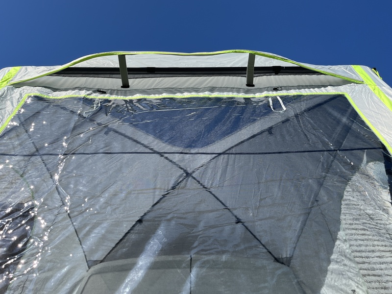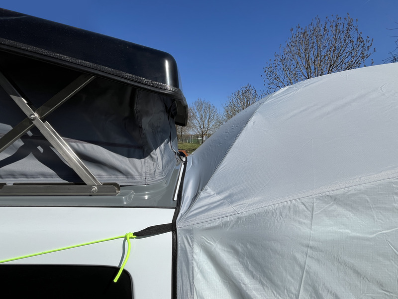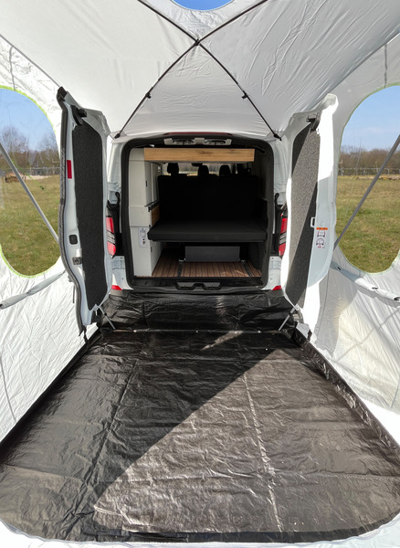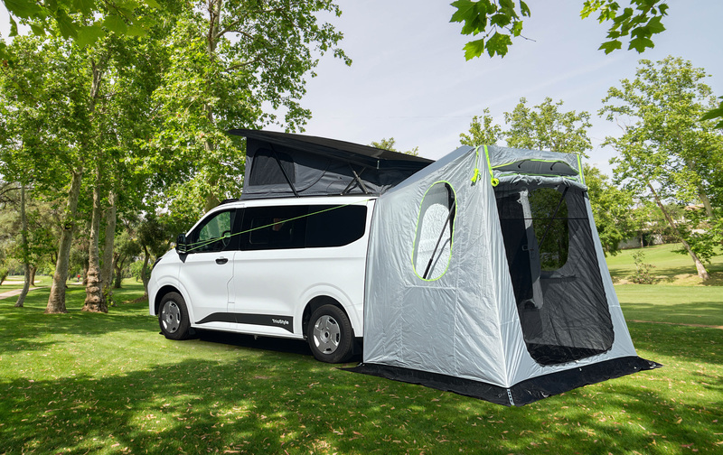 Upgrade Dome Premium для VW T5/T6, новый Transporter, Ford Transit / Tourneo Custom с 2023 г.в. с распашными задними дверьми. Двери можно закрывать при необходимости. Большая передняя дверь с окном, шторкой и москитной сеткой (дверь можно использовать как маркизу перед входом). Боковые стенки с овальными окнами и окно в крыше обеспечивают отличный круговой обзор. Вшитый пол со встроенной ветрозащитой под бампером. Высота монтажа на кемпервен - 210 см.